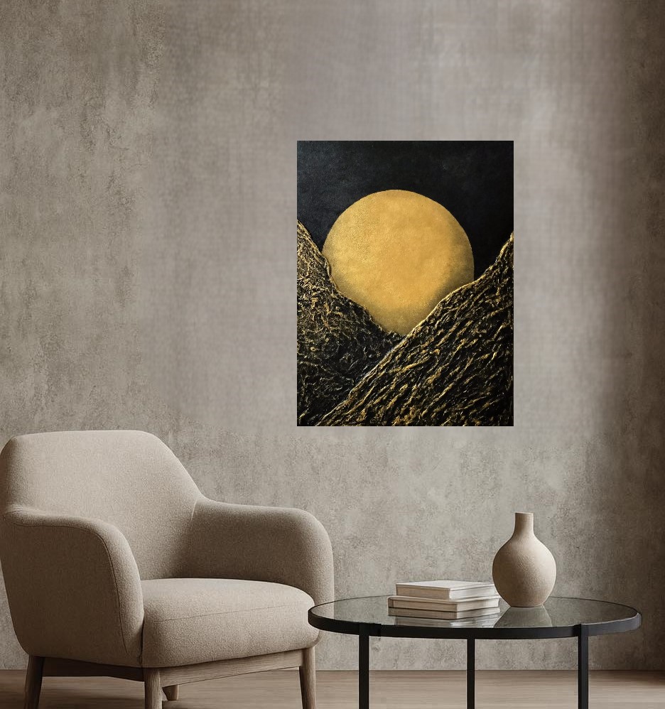 Akryl na płótnie o wymiarach 60 x 80, bez ramy. Boczne krawędzie płótna są zamalowane jako kontynuacja frontowej kompozycji obrazu.