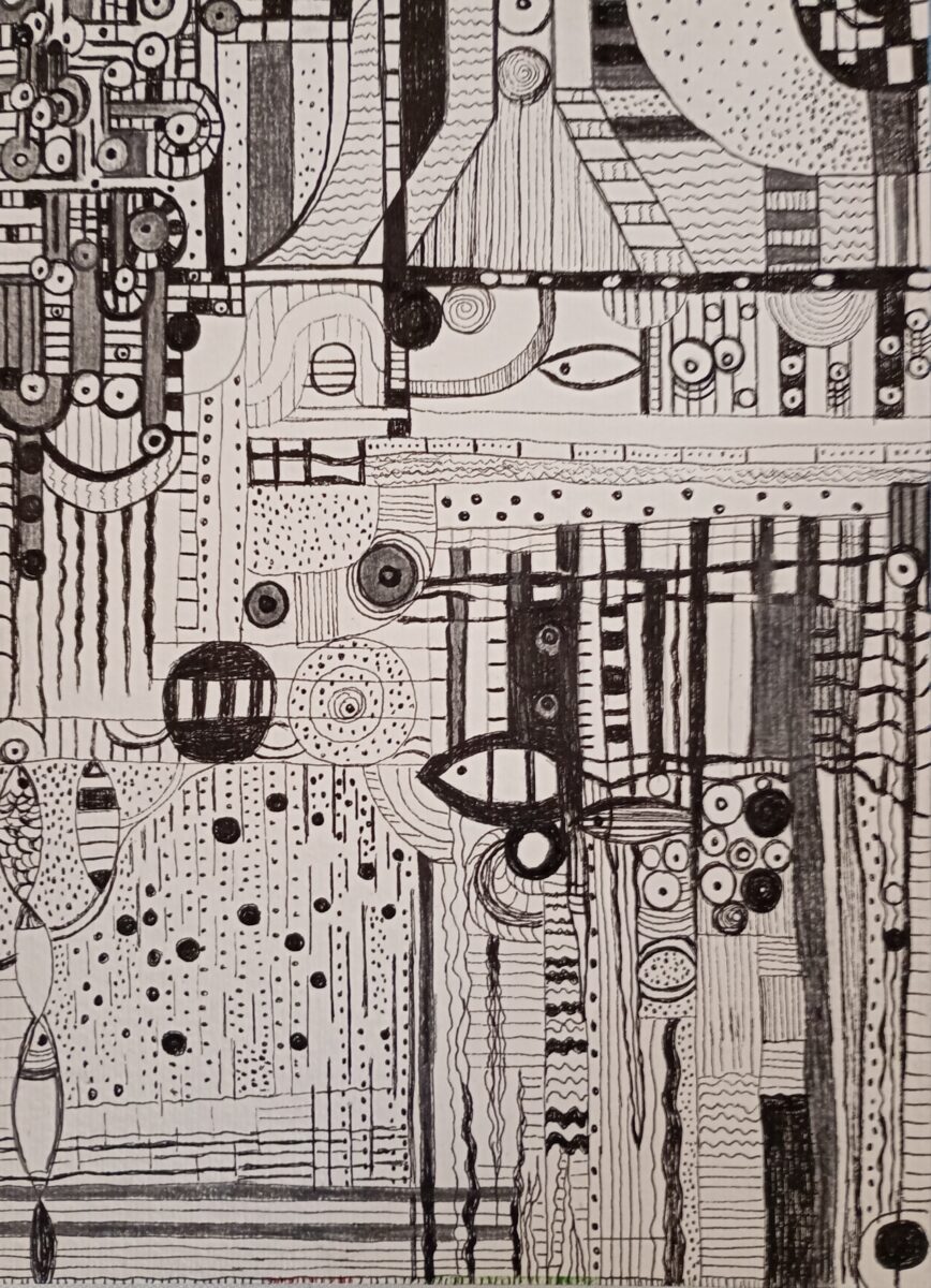 BIAŁE I CZARNE, praca wykonana na papierze akwarelowym techniką mieszaną” ołówek, flamaster i rapitograf. Wymiary: 21 cm x 29,5 cm.