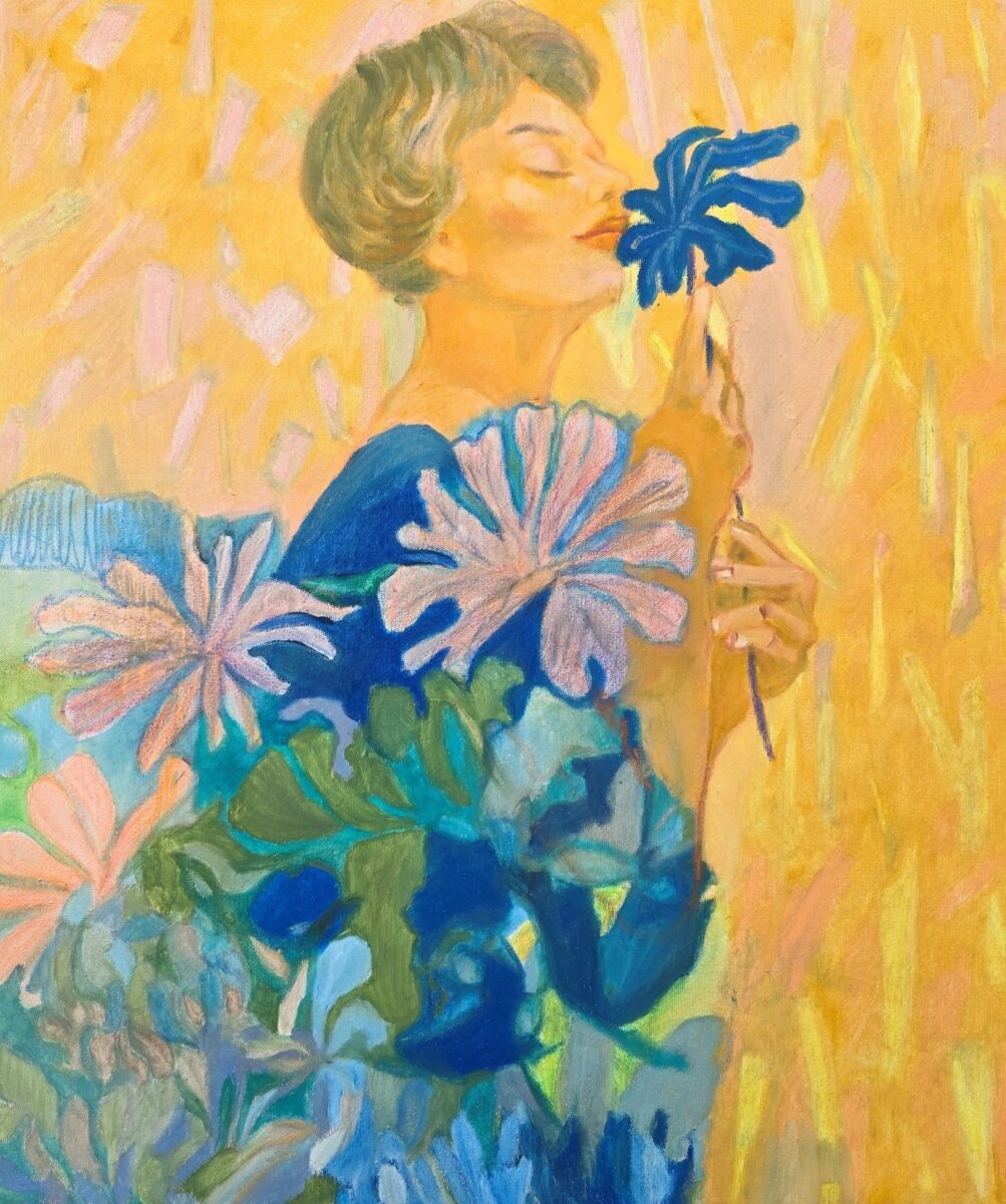 Kolorystyka – oparta na ciepłych, świetlistych żółciach i kontrastujących z nimi chłodnych błękitach – kreuje aurę nastrojowego zawieszenia, w której natura zyskuje status bohatera na równi z człowiekiem. Kwiaty są nie tylko ozdobą sukni lub tła, ale stają się emanacją wewnętrznych przeżyć, językiem emocji zapisanym w formie i barwie.  Obraz-to poemat,: próba uchwycenia ulotnej harmonii, której nie da się zatrzymać, lecz którą można kontemplować jako fragment własnej pamięci i tęsknoty Obraz nie podaje gotowych odpowiedzi, lecz otwiera przestrzeń dialogu, zarówno z własnymi doświadczeniami, jak i z uniwersalnym światem natury, o którym nigdy nie przestajemy marzyć.