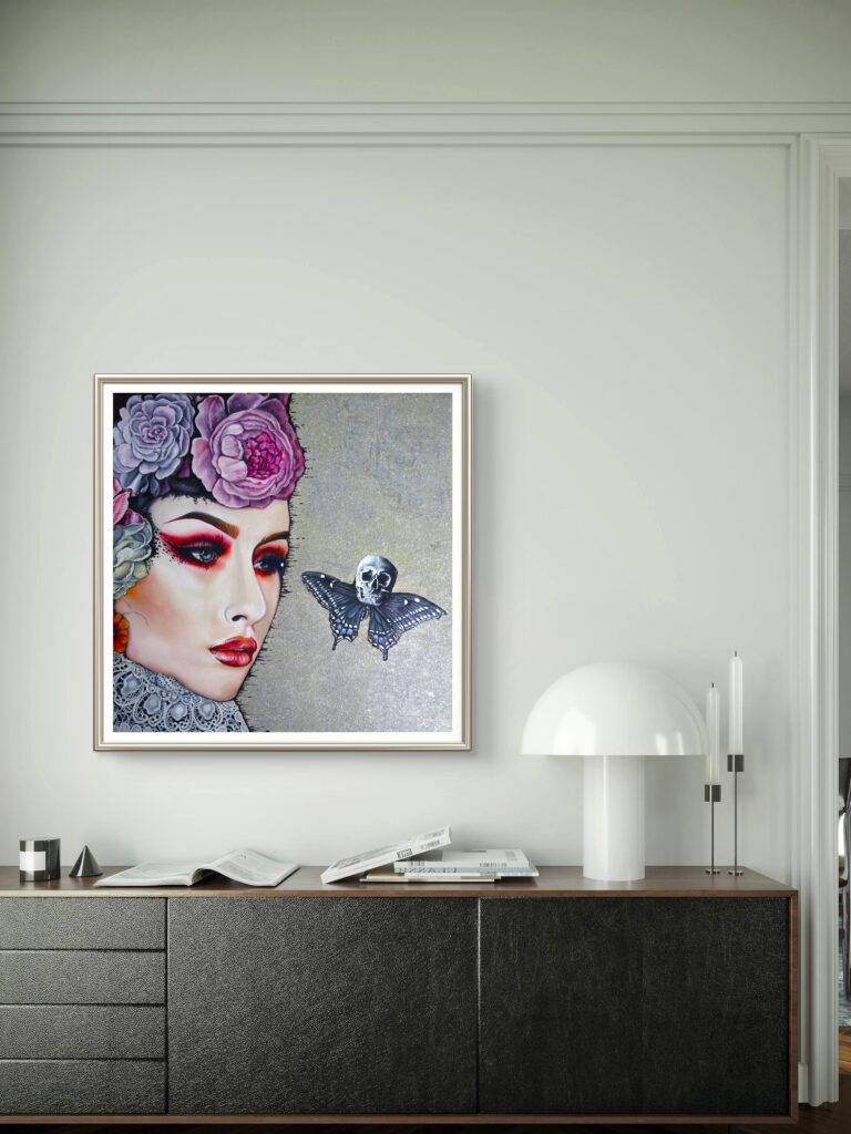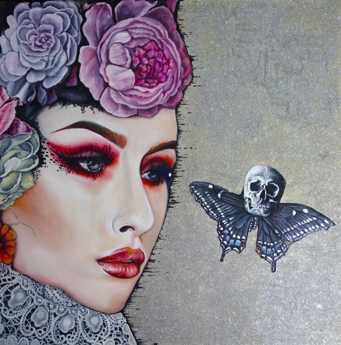 Elegancki portret, który kryje tajemnicę przemijania. Obok kobiety pojawia się motyl z czaszką, cichy znak kruchości piękna.