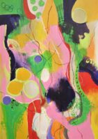 Abstrakcyjny obraz o szalonych formach i kształtach, intensywne barwy pogłębiają odczucie wesołości, wielkiej radości. Praca namalowana na włoskim podobraziu techniką akryl z wykorzystaniem różnej  struktury. Boki ma zamalowane, zbędna więc rama. Zawerniksowany. Sygnowany pełnym opisem z tyłu pracy. Obraz doskonały jako prezent dla nowożeńców, dla ludzi z poczuciem humoru.