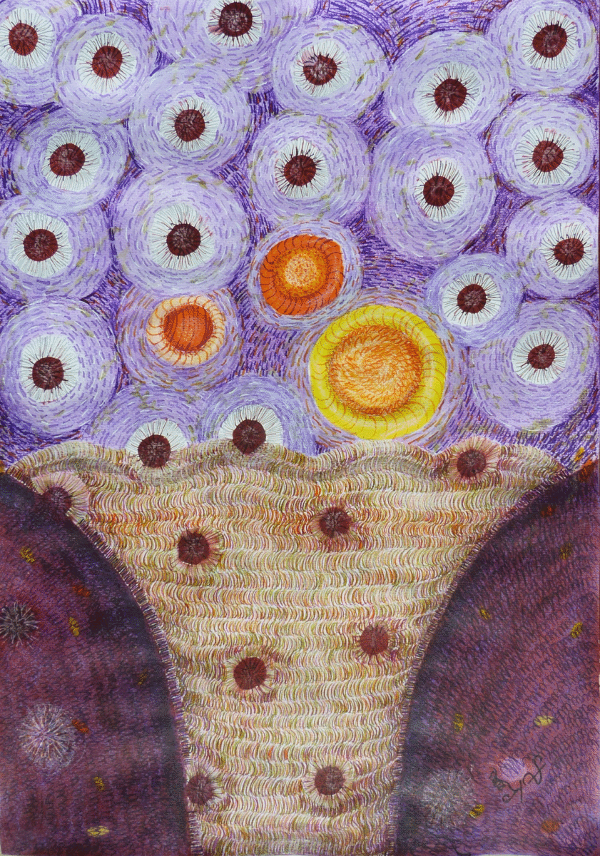 Grafika artystyczna, wymiary pracy: 29,7 cm /42 cm, 2023 r, kolorystyka grafiki zrównoważona z elementami ciepłymi, podpis autora w prawym dolnym rogu