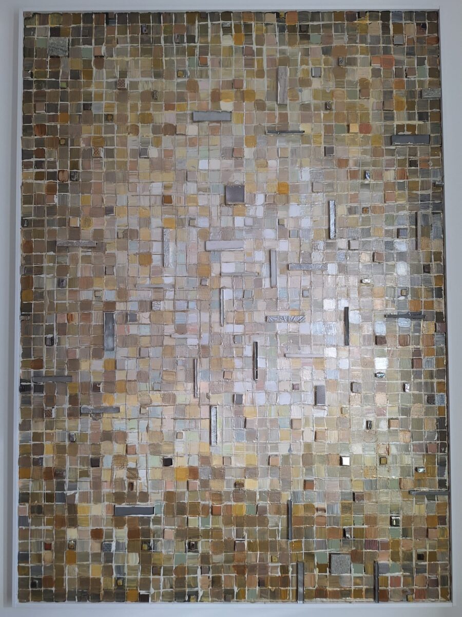 Jesienna tranformacja II to obraz akrylowy  ,kolaż , elementy szkła , ceramiki, metalu ,kamienia ,werniksowany. Podobrazie mdf, ramka biała szerokości 1 cm – przygotowany do powieszenia , bez potrzeby ramy i innych mocowań ,możliwość powieszenia w pionie i poziomie .