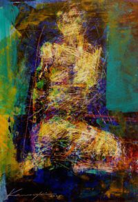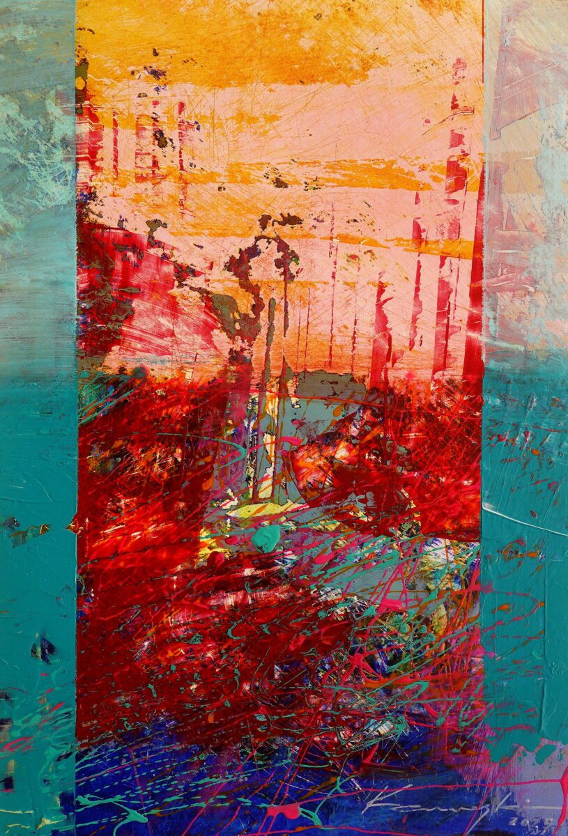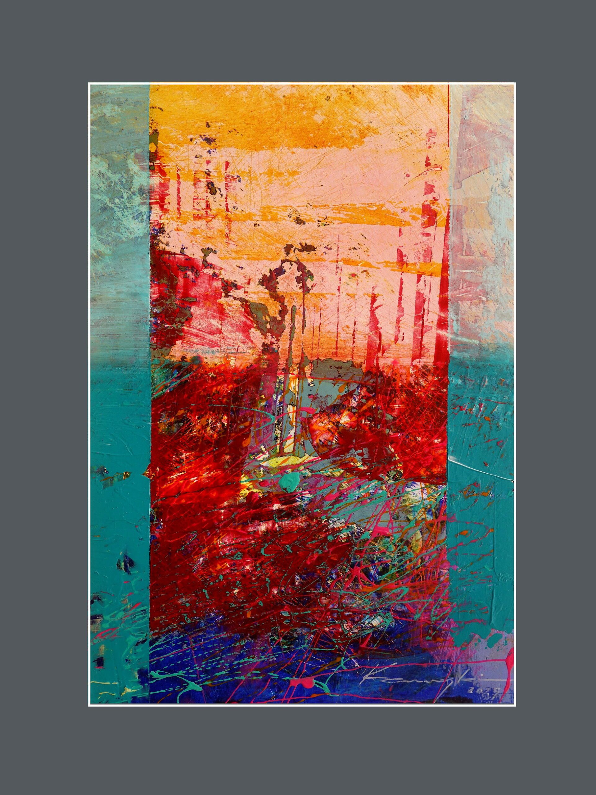 „Kompozycja  # 02” – format obrazu 28.5x19cm (w passe-partout 30×40), papier ENDURA proffesional, technika mieszana na bazie akrylu, rok 2025, praca sygnowana, Certyfikat oryginalności.