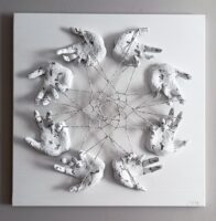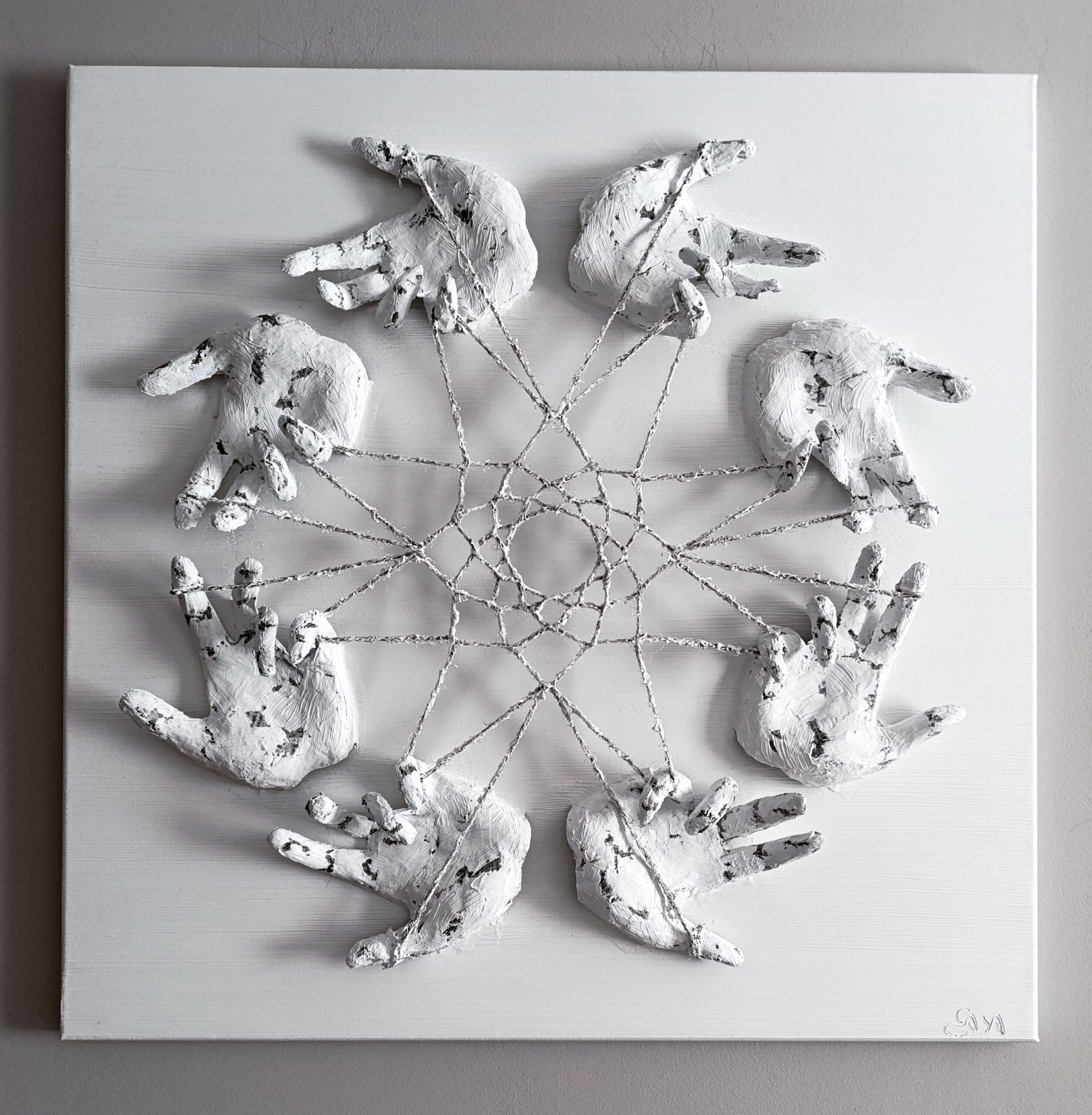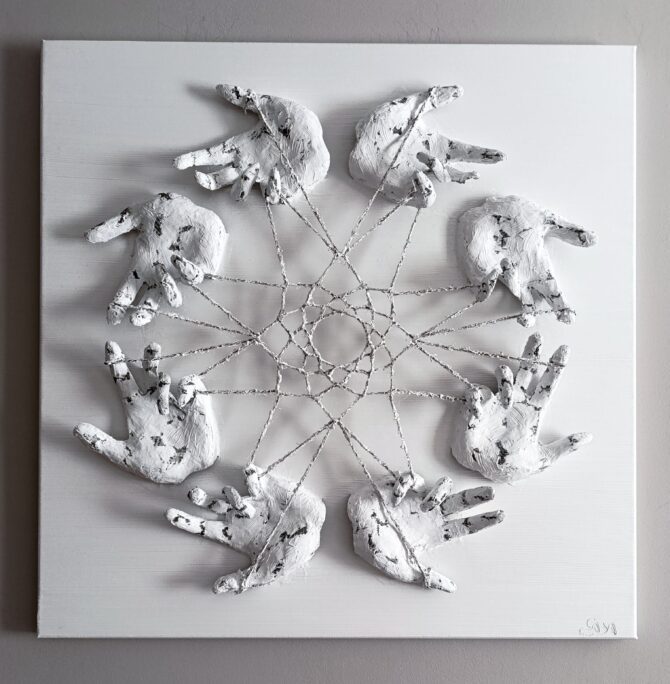 Łapacz marzeń, 70x70x5 cm, papier mache, sznur, płótno, olej, 2025r.