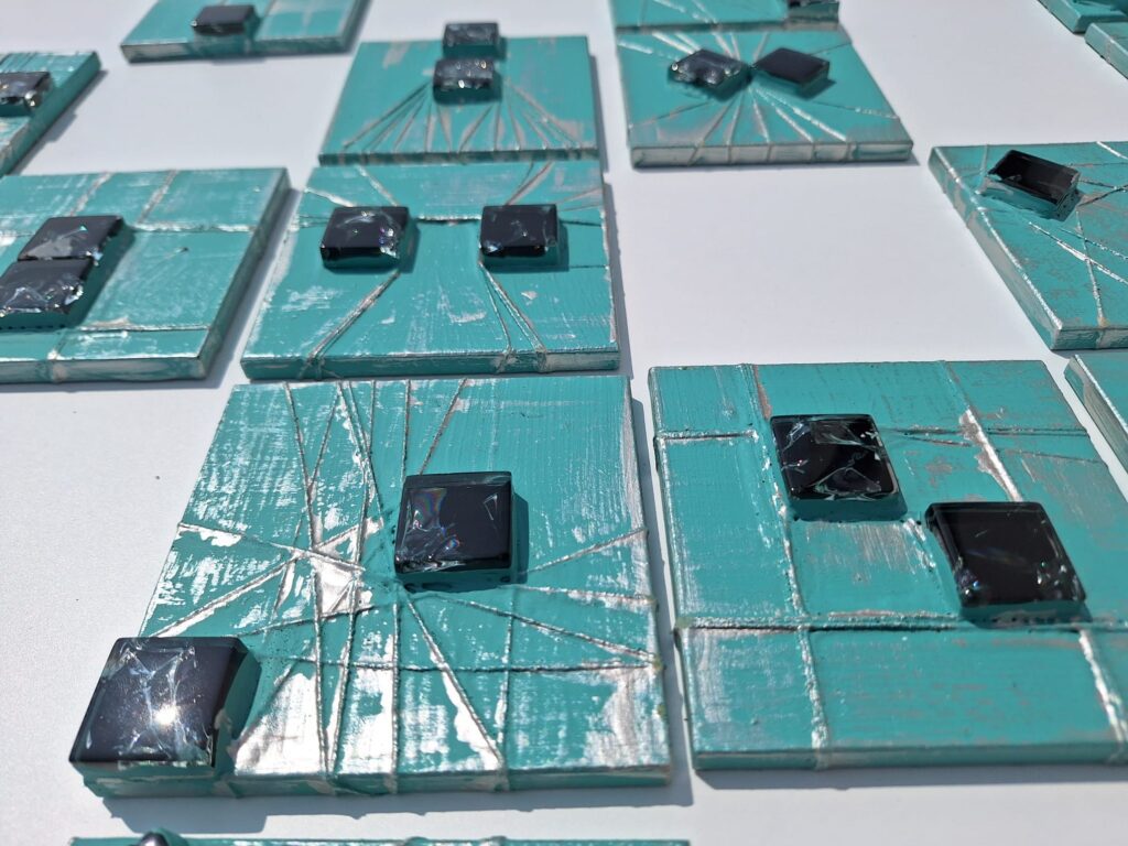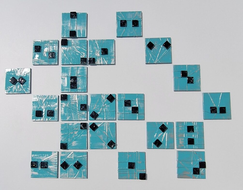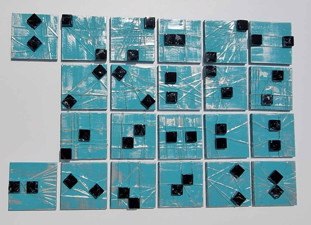 Obraz akrylowy, kompozycja składa się z 22 miniatur obrazków o wymiarze 10,6 cm x 10,6 cm x 1 cm i każdy można powiesić w dowolnej pozycji, podłoże płyta mdf , krawędzie zamalowane w tonacji obrazu – turkusowo- czarne elementy mozaiki ,werniksowany, sygnowany, przygotowany do powieszenia w dowolnej pozycji, powierzchnia obrazu fakturalna. Możliwość dowolnej konfiguracji a tym samym zmiany wymiarów .Idealny na prezent dla bliskiej osoby. Istnieje możliwość przesłania dokładnych zdjęć.