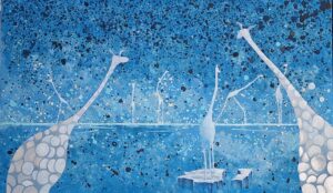„Mroźne żyrafy” 100×60, olej na płótnie, 2026 , praca sygnowana, bez oprawy, certyfikat oryginalności.