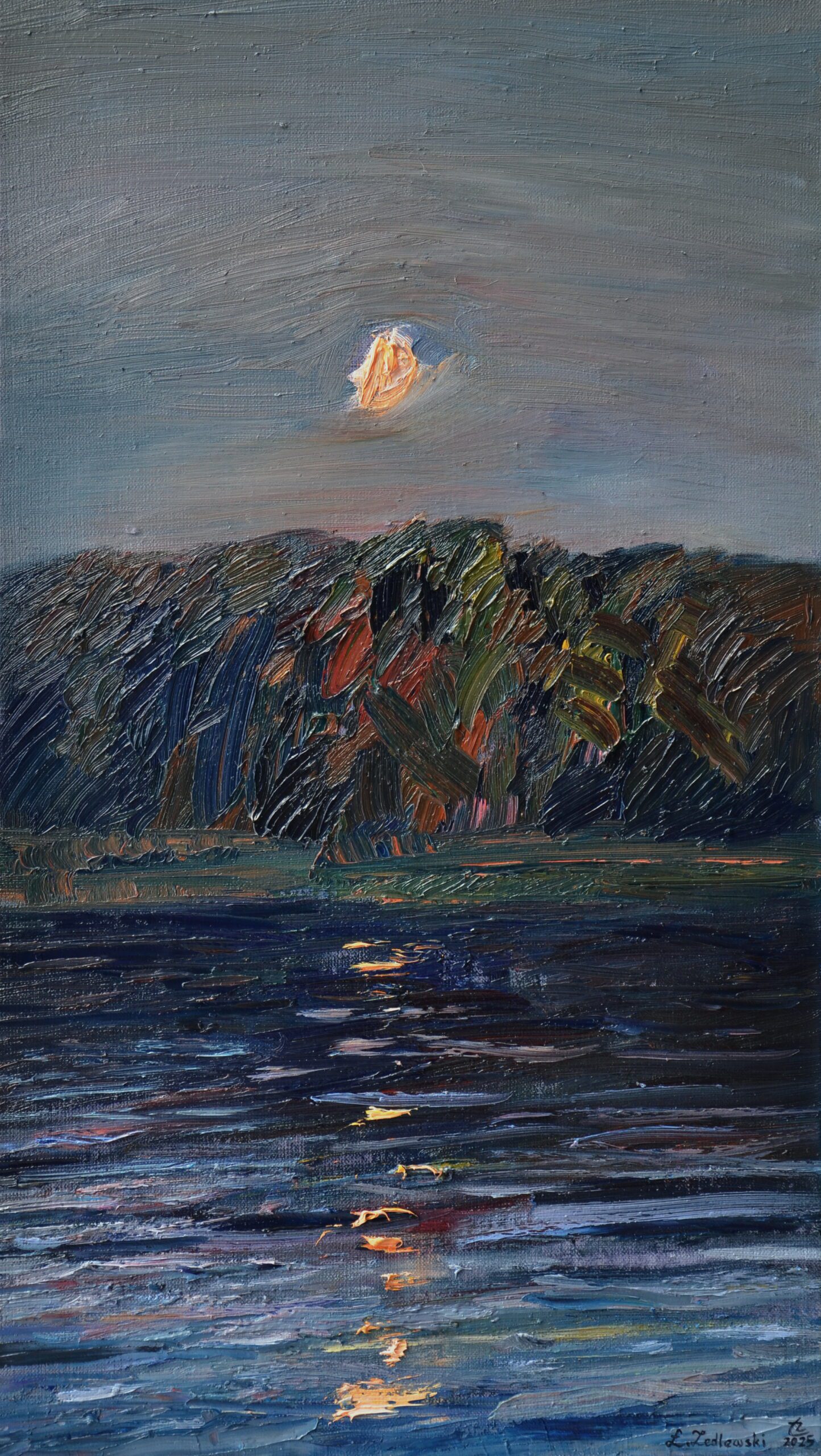 Pełnia, Zielonowo, technika :olej na płótnie, wymiary 70x40cm, 2025, praca sygnowana przez artystę, certyfikat oryginalności do zakupionego dzieła.