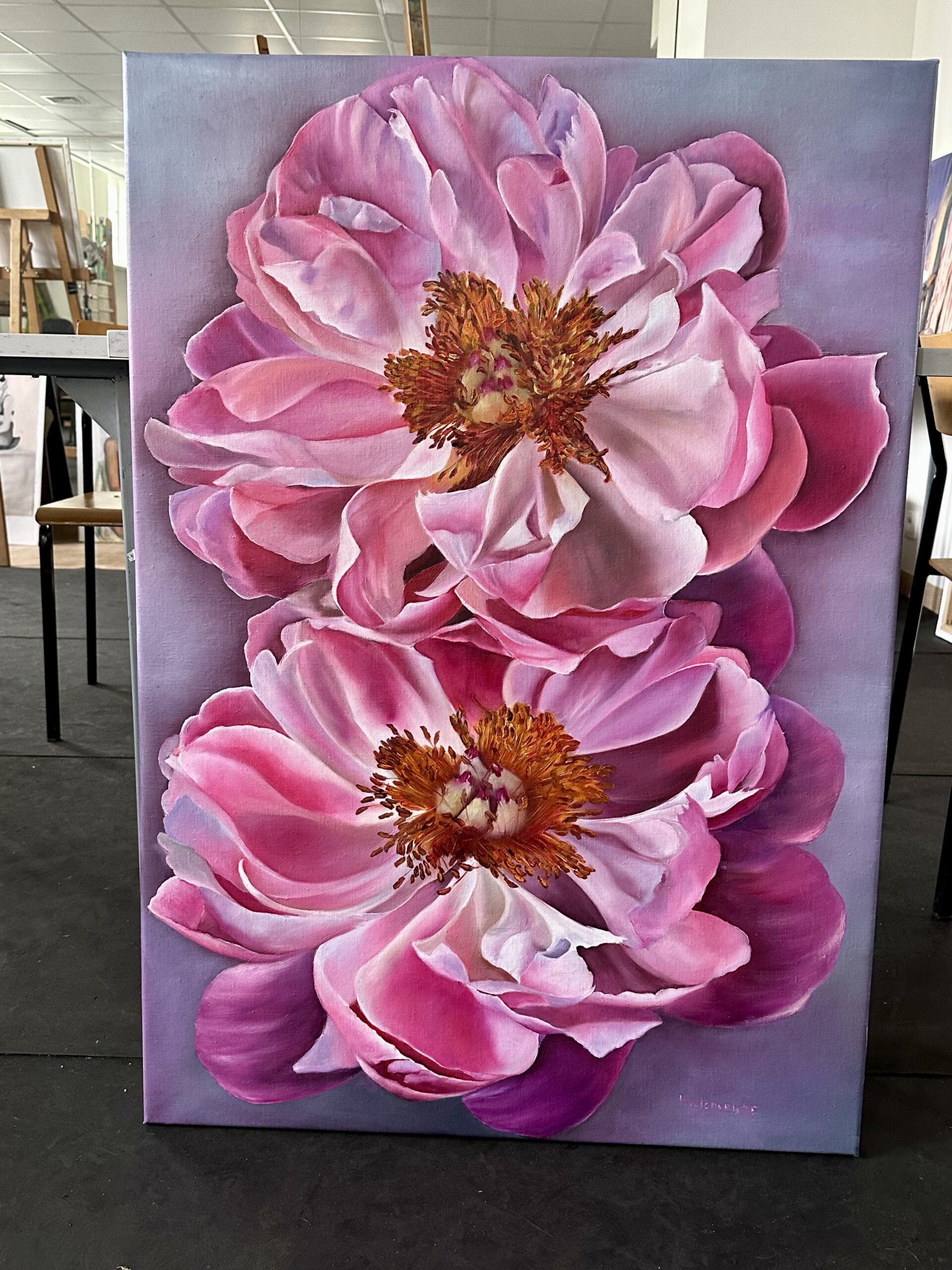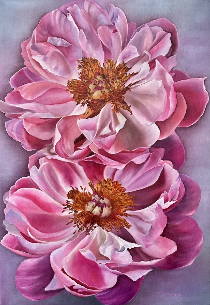 „Radość” to pełen światła i delikatności obraz z dwoma kwiatami piwonii w różowych odcieniach. Subtelne przejścia barw i miękkie pociągnięcia pędzla wprowadzają spokój, harmonię i lekkość.