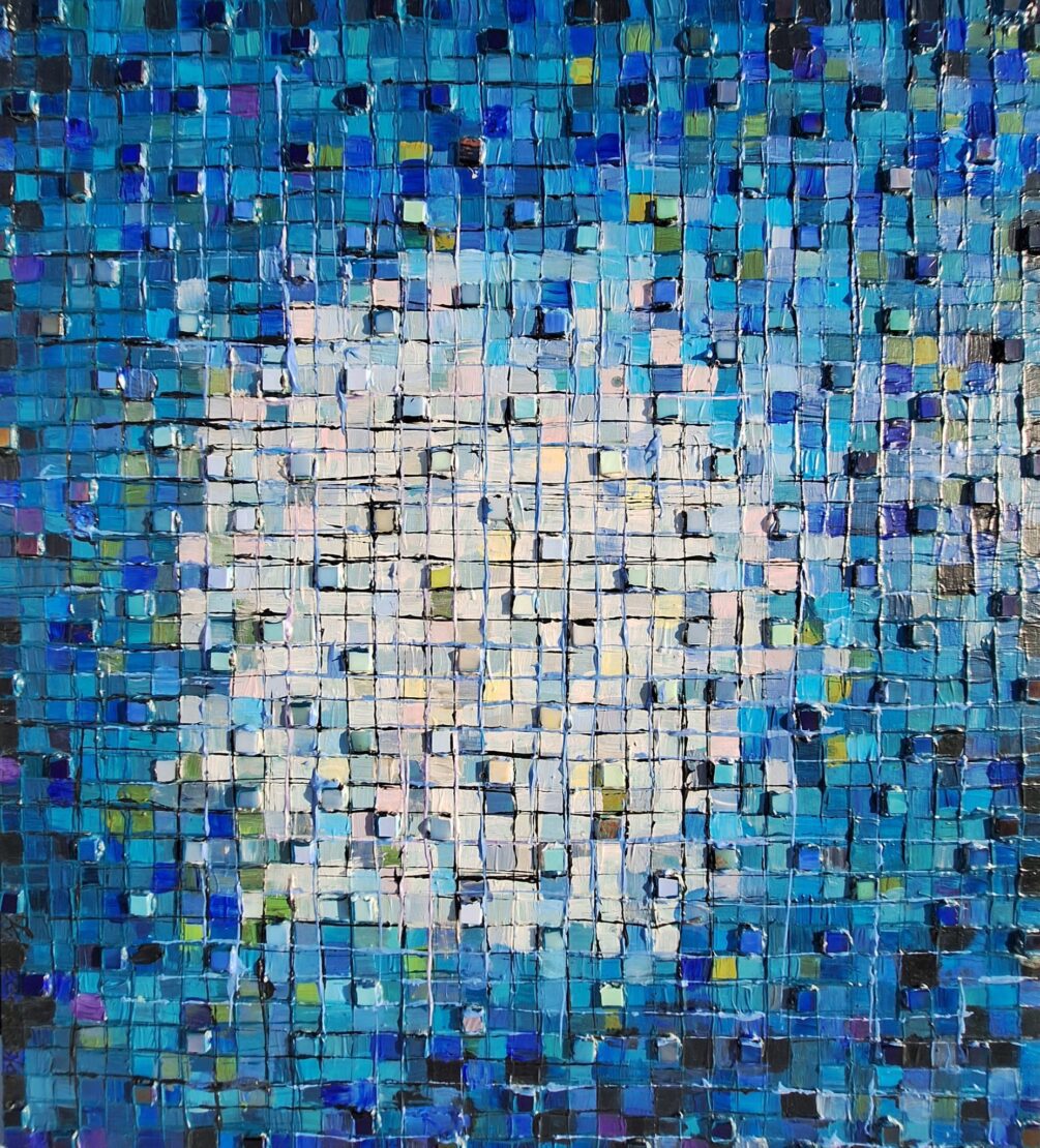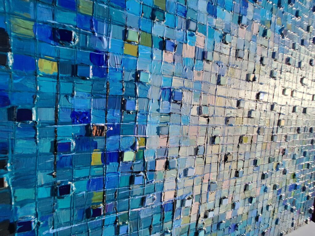 Obraz akrylowy, podobrazie 3 d mdf wymiar 84,5 cm x 76 cm x 3 cm ,elementy mozaiki, fakturalny, możliwość powieszenia w pionie i w poziomie, przygotowany do powieszenia bez potrzeby ramy , zamalowane krawędzie w tonacji obrazu, werniksowany.