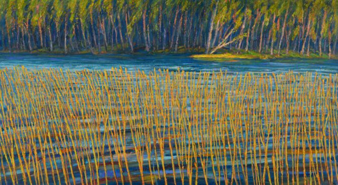 Trzciny (jezioro Pluszne), wymiary 90x160cm, technika:olej na płótnie, 2025, praca sygnowana, certyfikat oryginalności do zakupionego dzieła .