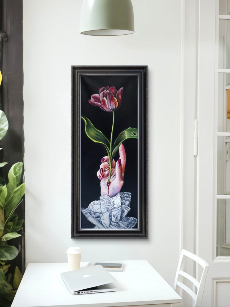 Tulipan, olej na płótnie, 80 x 30 cm, 2025, opisany na odwrocie, bez oprawy, praca sygnowana przez artystkę, Certyfikat oryginalności do zakupionego dzieła.
