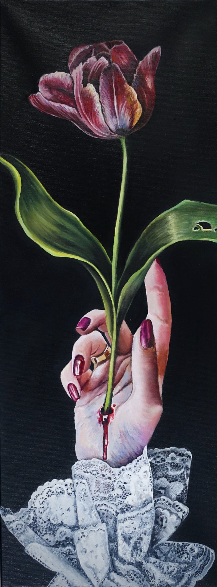 Z dłoni w wiktoriańskim koronkowym mankiecie wyrasta tulipan. Obraz symbolizuje odrodzenie i nieustający cykl życia